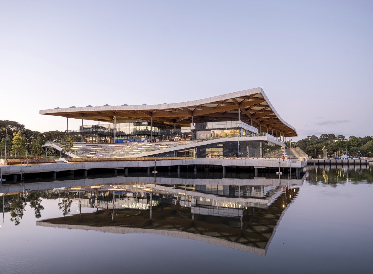 More than just an architectural statement, the roof plays a crucial role in the market’s sustainability strategy. Designed to collect rainwater for reuse and harness solar energy, it also uses natural ventilation to extract warm air while shielding workers from harsh southerly winds. Sustainability extends to logistics. The European GLT beams were shipped as single elements in the hull of a bulk cargo carrier and delivered by barge—never touching Australian roads. This approach minimised pollution and reduced disruption to the local community.