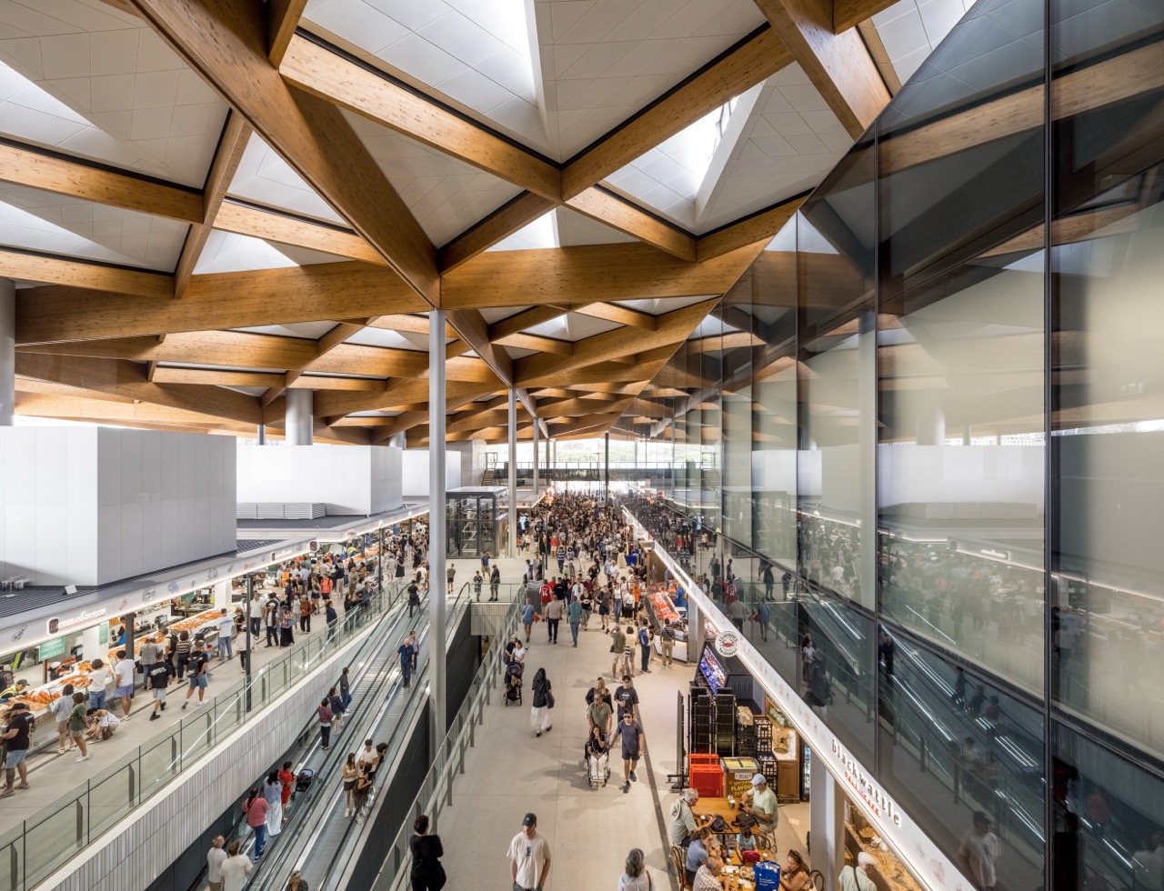 A standout feature of the new market is its striking 230-metre-long, wave-like timber roof, engineered by Theca Timber’s partners, Rubner. Made from 1,800 m³ of spruce glue-laminated timber (GLT) and over 50 tons of steel, the roof’s sweeping form ties the entire structure together, giving the market a bold and elegant identity.