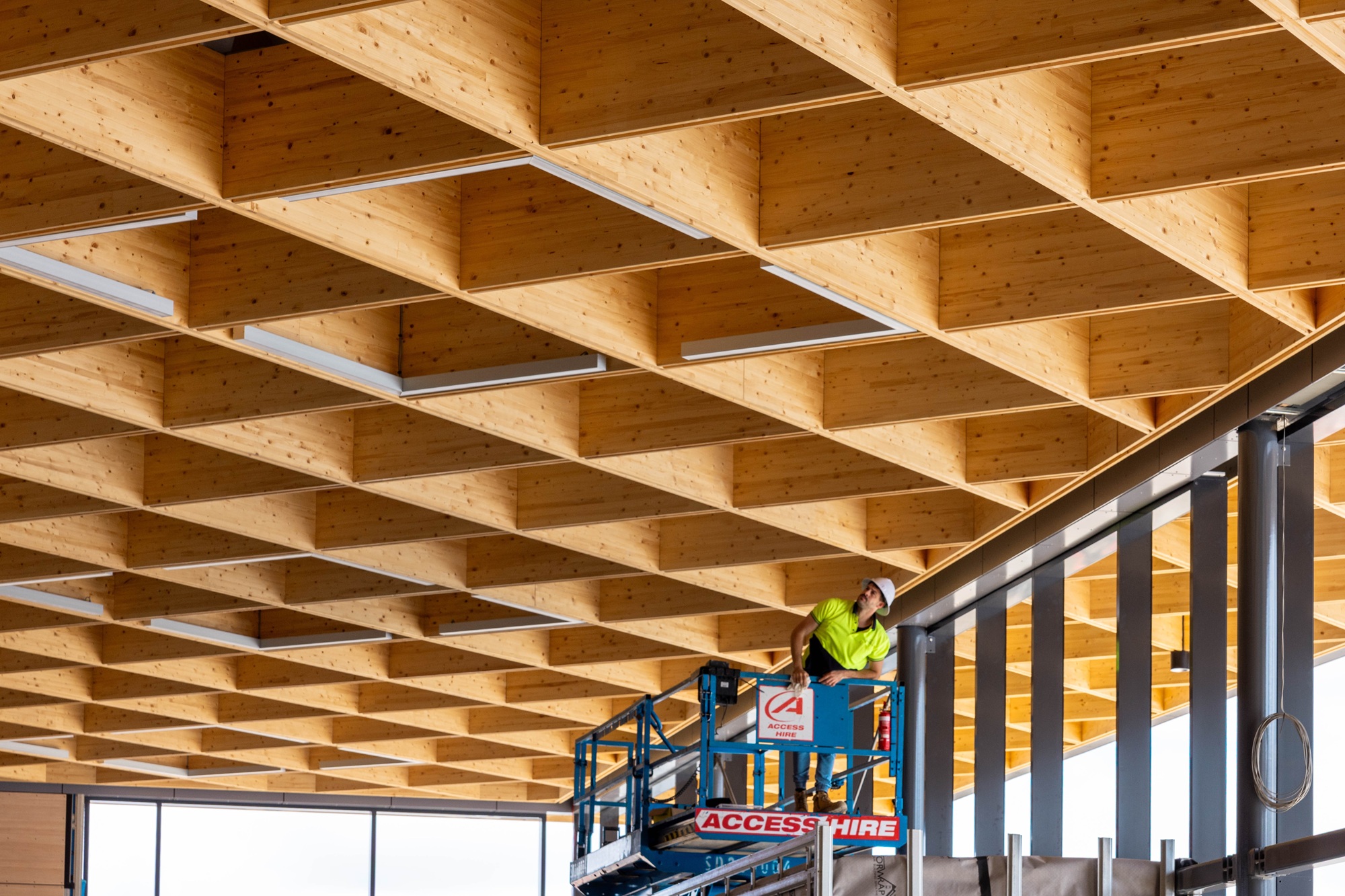 Theca Timber played a vital role in bringing this vision to life, working alongside a dedicated project team to ensure the successful delivery of this complex timber geometry. From the initial design stages to the practical completion of the ceiling, the project highlights the seamless integration of modern timber technology within large-scale public infrastructure.
